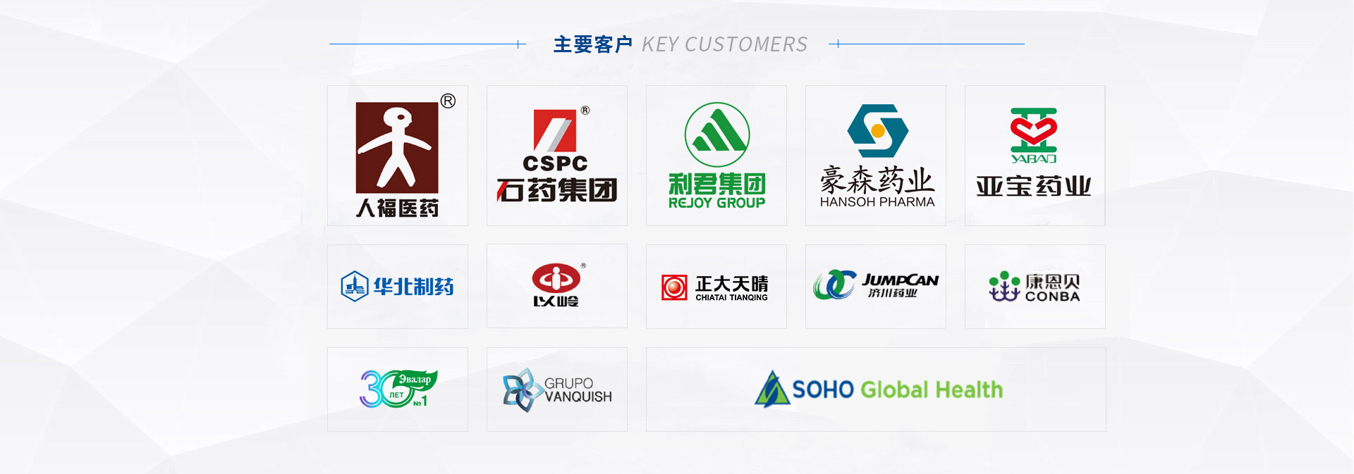我們的客戶:華藥集團 | 石藥集團 | 九州藥業 | 以嶺藥業 | 正大天晴 |武漢人福 | 西安利君 | 山西亞寶 | 濟川藥業 | 中山達安基因 | 恒升醫學 | 九州通 | 康恩貝 |四環(huán)藥業 |豪森藥業 | 哈藥集團 | 東北制藥 | 武漢麥鑫利